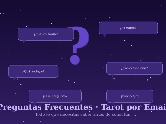Resolvemos las dudas más comunes sobre el tarot por email: cómo funciona, cuánto tarda, si es fiable, qué incluye y mucho más. Toda la información que necesitas antes de tu consulta.